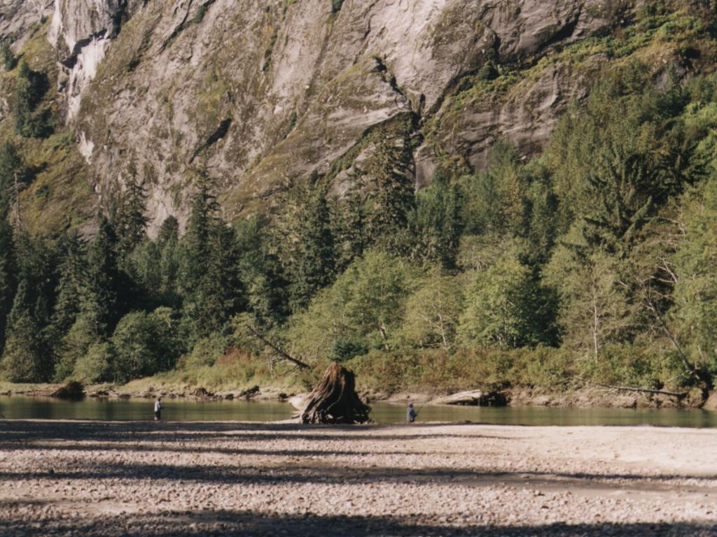 hochaufragende Felswände, ein überdimensionaler Baumstumpf und daneben zwei Angler (am Skeena